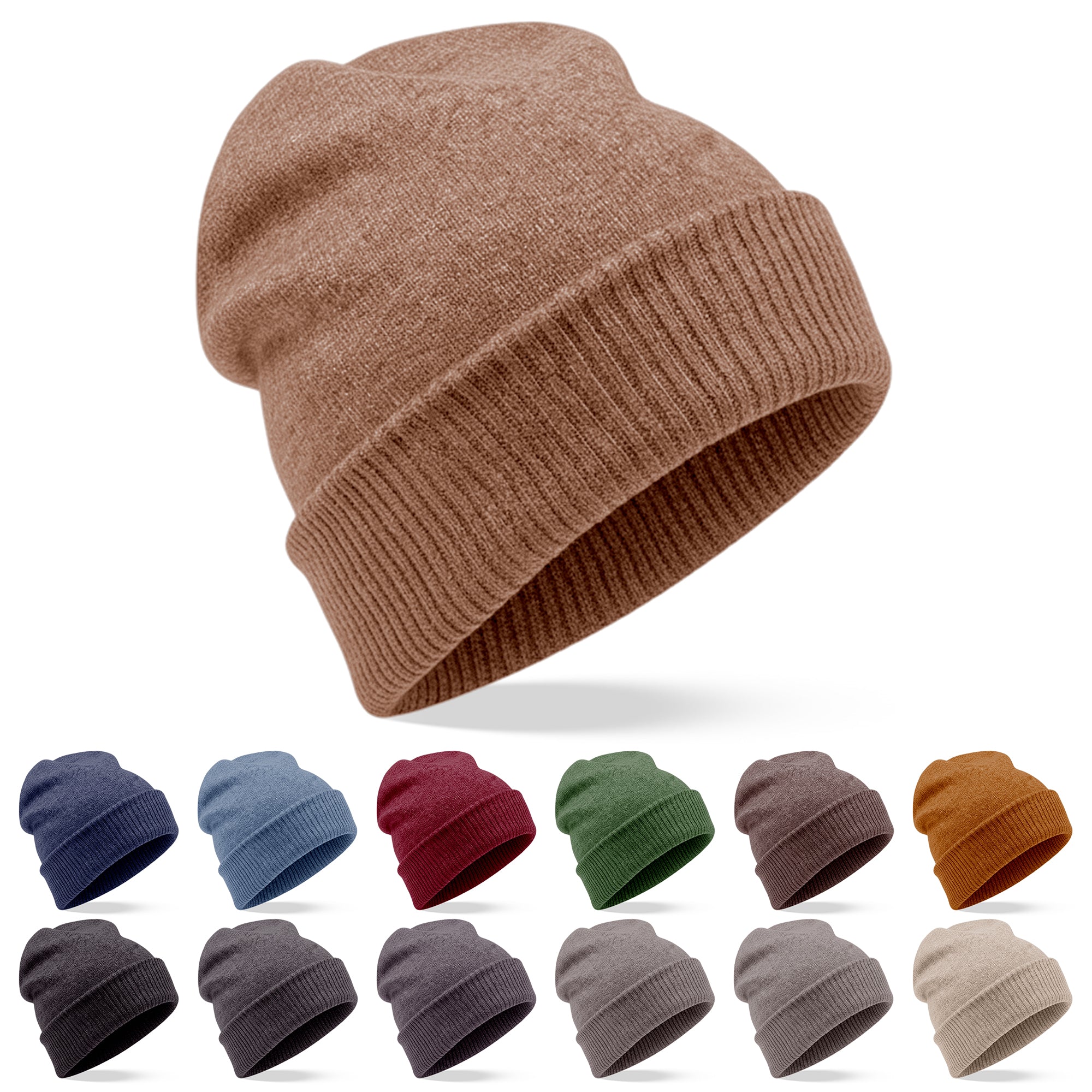Kaschmirmütze Beanie glatt mit geripptem Umschlag Braun