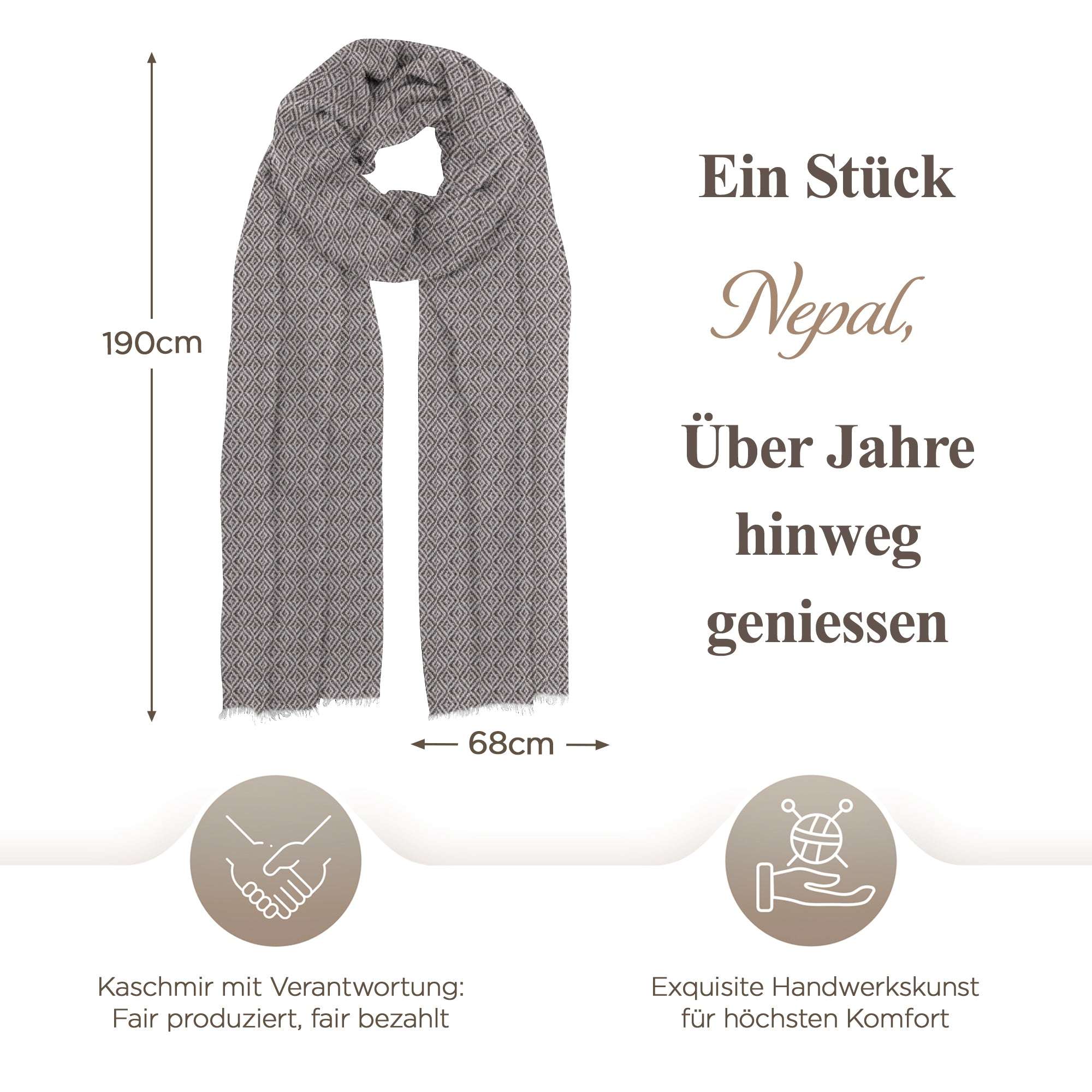 Unsere Kaschmirprodukte stammen aus der atemberaubenden Himalaya-Region Nepals. Dort, in den majestätischen Bergen, finden Sie die Heimat der Kaschmirziegen, die eine der kostbarsten und weichsten Fasern der Welt liefern - Kaschmirwolle. Die traditionellen Techniken des Kaschmirhandwerks wurden über Generationen hinweg von lokalen Handwerkern in Nepal weitergegeben, um die herausragende Qualität unserer Produkte zu gewährleisten.